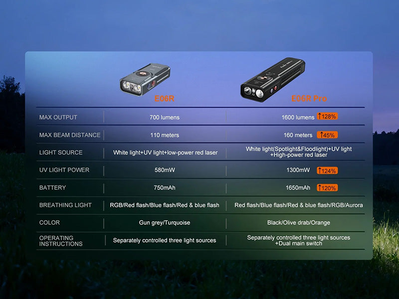 Fenix E06R Pro est une lampe multifonctionnelle haute performance avec système triple source lumineuse, combinant une LED blanche puissante de 1600 lumens, une lumière UV 365nm et un laser rouge amélioré. Dotée d'un projecteur et d'un éclairage diffus réglables avec une distance de faisceau maximale dépassant 160 mètres, elle est conçue pour répondre aux besoins d'éclairage des déplacements quotidiens et des aventures outdoor professionnelles.