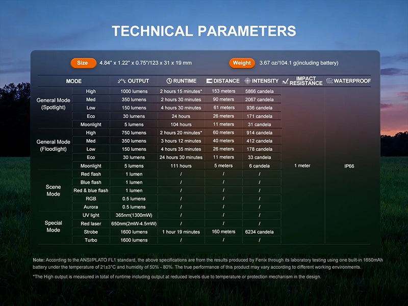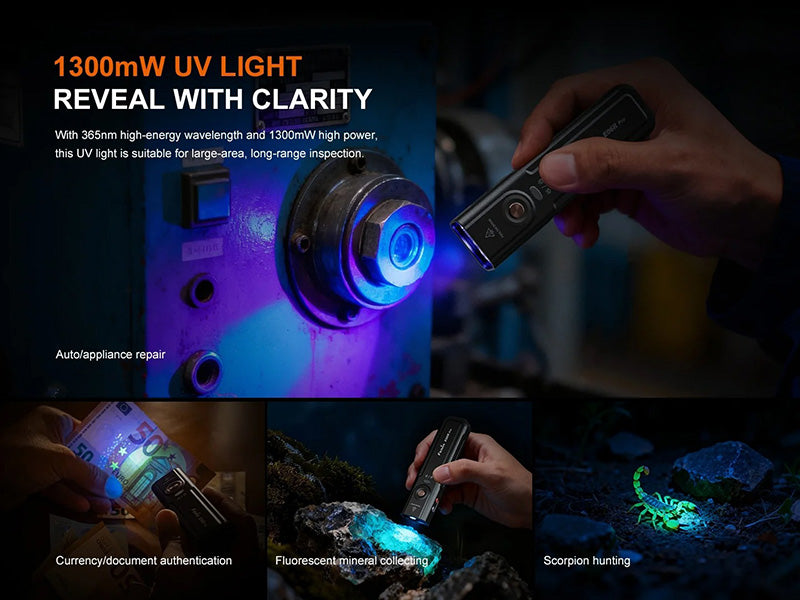 La lampe propose 19 modes d'éclairage adaptés à toutes les situations : cinq niveaux de projecteur et cinq niveaux d'éclairage diffus pour une polyvalence maximale, lumière UV 365nm (1300mW) pour la détection, laser rouge 650nm (2mW-4.5mW) pour le pointage de précision, et anneau lumineux 3D innovant offrant cinq effets d'éclairage (Red flash, Blue flash, Red & blue flash, RGB, Aurora) servant à la fois de lumière d'avertissement d'urgence et d'outil polyvalent pour créer des ambiances. Ses modes Strobe et Instant Turbo optimisent l'utilisation tactique, tandis que son circuit de mémoire intelligent mémorise le dernier niveau de sortie utilisé.